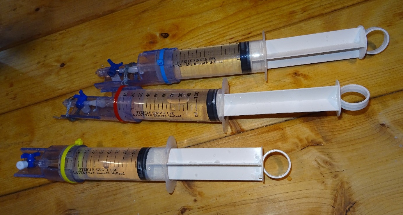 Ausgeschlafen und gut gefrühstückt trafen wir uns am Morgen des 9. Juli am Wilhelm Syben Hauses für den praktischen Teil des SK Gewässerkunde. Wir bereiteten unsere Tauchausrüstung vor und teilten die Buddy-Teams ein. Jedes Buddy-Team bekam die Aufgabe die Wasserprobe in einer bestimmten Tiefe zu nehmen. Die theoretische Handhabung der Wasserproben-Entnahme mit der Spritze wurde nochmals durchgesprochen, so dass nichts schief gehen sollte. Letztlich sollten wir Proben in 2 m, 3 m und 5 m Tiefe nehmen. Das Buddy-Team welches die Entnahme in 5 m Tiefe durchführen sollte, wurde vom ortskundigen Wolfgang geführt. Dies war auch sehr gut so, da die Sicht äußerst bescheiden war. Teilweise war nur Wolfgangs Tauchlampe und die gespannte Führungsleine zu sehen, mehr nicht.