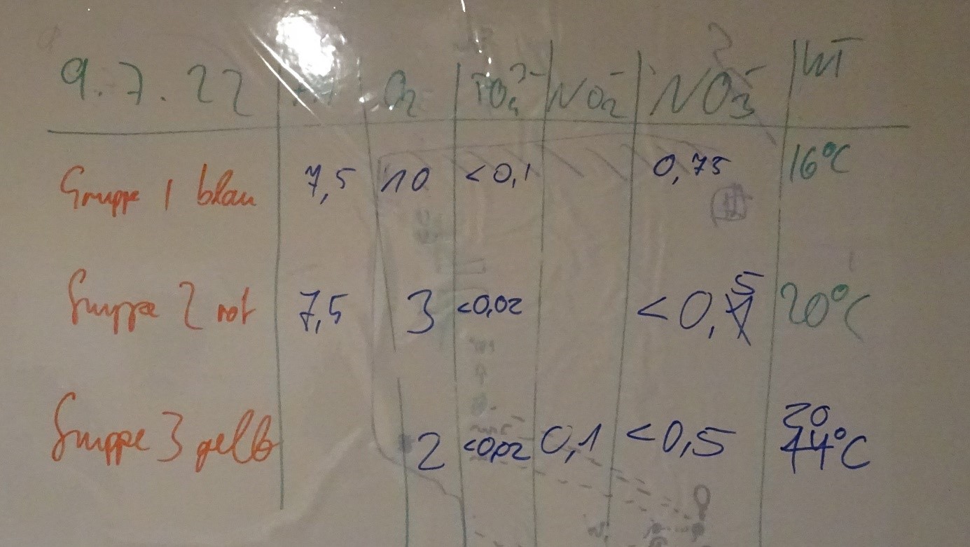 Es fühlte sich ein wenig an wie zu damaligen Schulzeiten im Chemie-Unterricht. Es wurde viel gelacht und es hat allen viel Spaß gemacht. Nachdem dann die relevanten Werte (PH, Sauerstoff O2, Phosphat PO4, Stickstoffdioxid NO2, Nitrat NO3 und die Wassertemperatur) notiert waren, hatte Wolfgang zu diesen Werten Stellung genommen. Alle Werte wurden letztlich korrekt von uns analysiert und stehen logisch im Zusammenhang mit der Tiefe, in denen die Wasserproben entnommen worden sind. Gute Arbeit ;-)