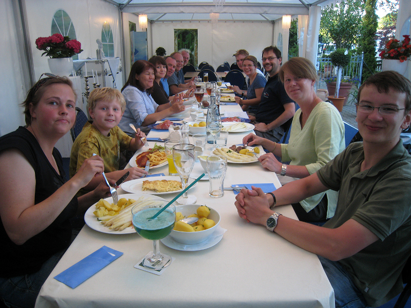 Pünktlich, genau um 18:00 Uhr, wie verabredet, sind wir an der Gaststätte eingerollt. Andreas honorierte auch hier die sportlichen Leistungen durch die erste Runde auf Kosten des Vereins. Durch ein kleines, unangekündigtes Quiz über die Fahrradtour, konnten wir die Wartezeit bis der Spargel zubereitet war, gut überbrücken und auch Jürgen und Inge konnten sich kurzentschlossen noch zu uns gesellen. Das beste Resultat im Quiz erreichten Mareike und Paul. Belohnt wurde dieses durch ein schickes Tarier-Notfall-Set – und eine Flasche Wein (nicht für Paul!).